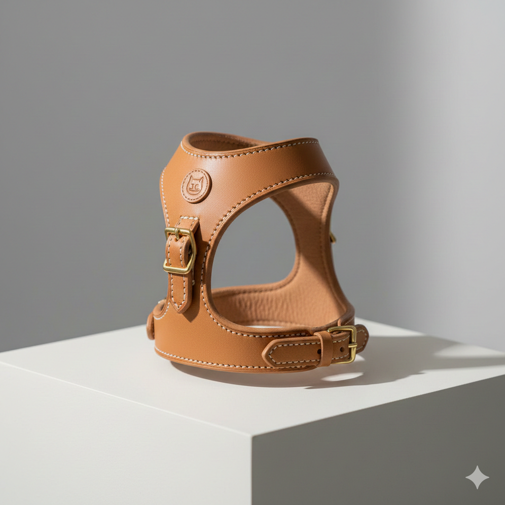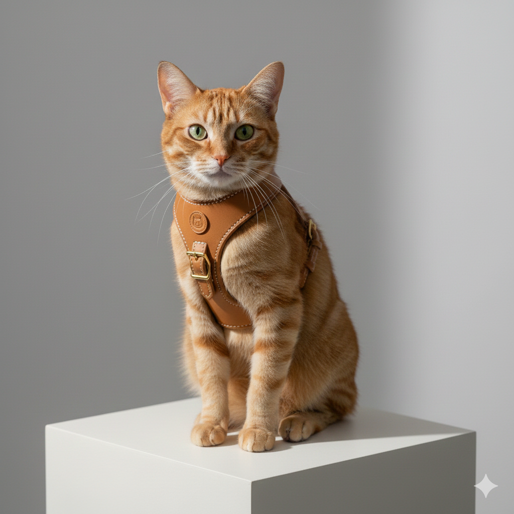Arnés ajustable y ergonómico para gatos, fabricado con materiales resistentes y suaves. Ofrece comodidad, seguridad y estilo en cada paseo, con un diseño minimalista y elegante en color marrón.