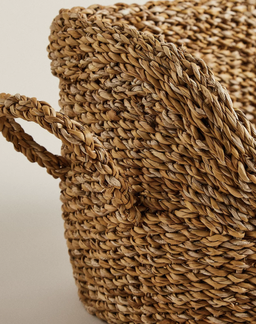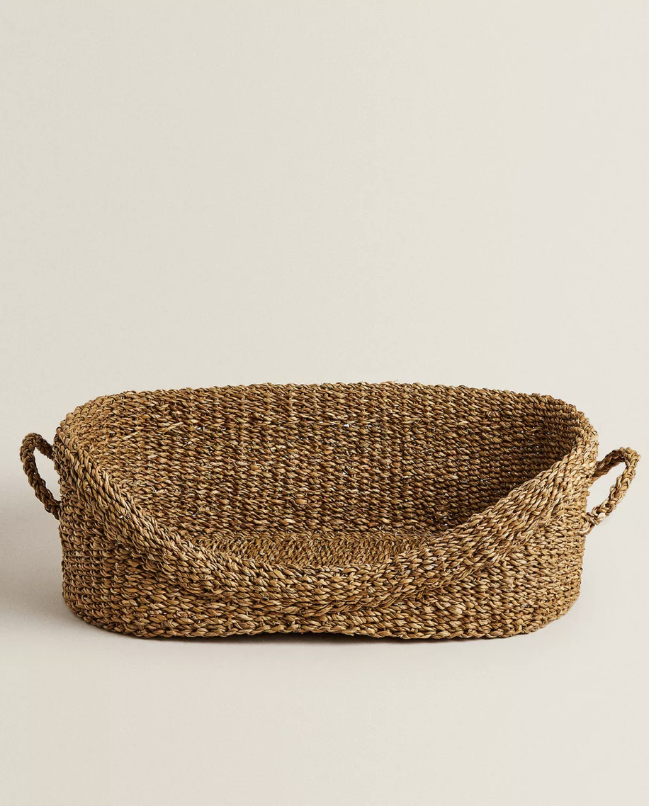 Cama para mascotas de seagrass trenzado con forma ovalada. Tiene un asa en cada lateral.